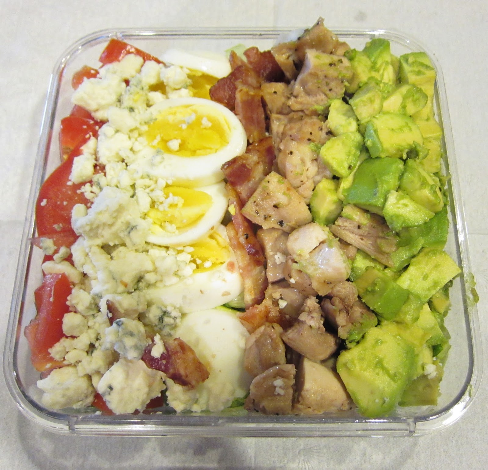 So for lunch 4 weeks ago, I made cobb salad. If people normally dislike salad, then this is the salad they would like. Much less lettuce and greens but more hearty ingredients like hard boiled eggs, blue cheese, bacon, chicken, and avocado. Truth be told that this was a bit too heavy for me on a daily basis for a week. But I enjoyed it. Having a salad like this once in awhile is quite nice.