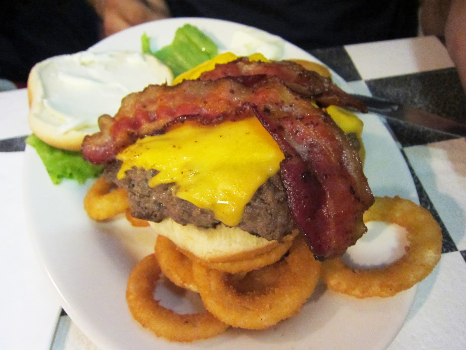 You'll find a thick hand formed patty. Add cheese and bacon if you please. But skip the onion rings. In fact, skip the sides in general. I'll get back to that later.