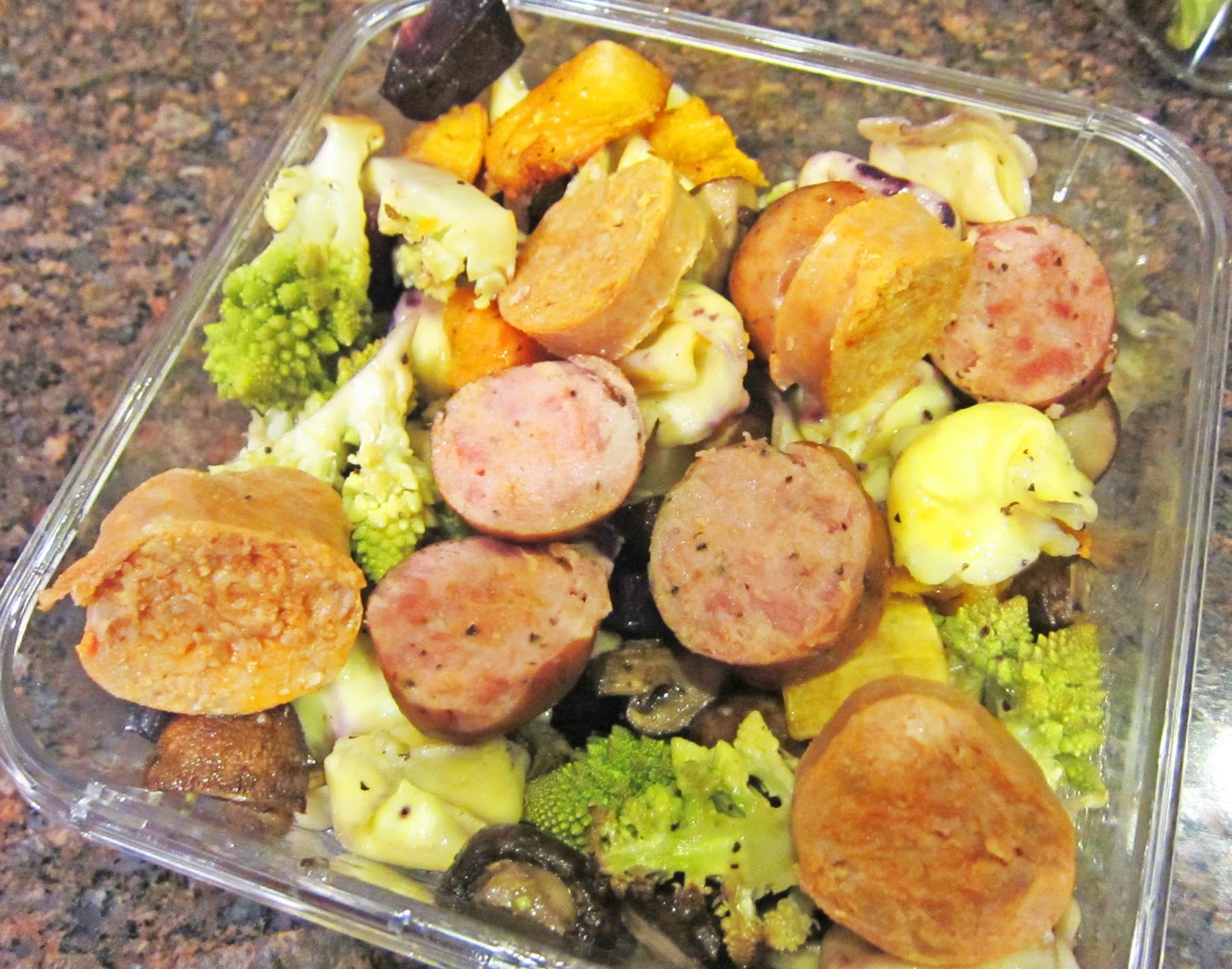 Fall and winter is definitely here. So that means more heartier lunches to keep me warm and comfy. But that doesn't mean it has to be bad for you. This week, I roasted lots of vegetables, added some sausages, and tossed all of that with some sausages. The result is a good mix of textures, flavors, and nutrients.